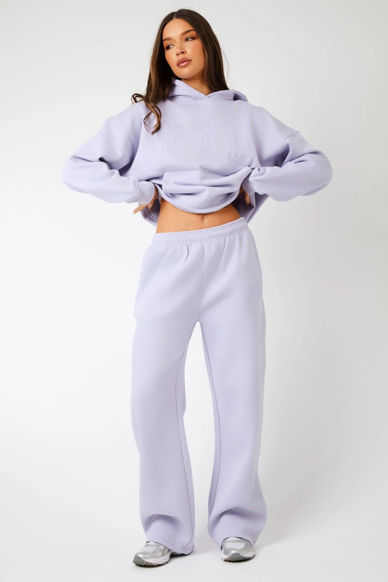 These ultra-soft joggers in iced lilac are the perfect blend of comfort and style. The flattering wide leg design features a signature logo and is crafted from a luxurious fabric for all-day ease. Ideal for cozy yet stylish loungewear, these joggers ensure a relaxed fit. Perfect for your everyday casual look.