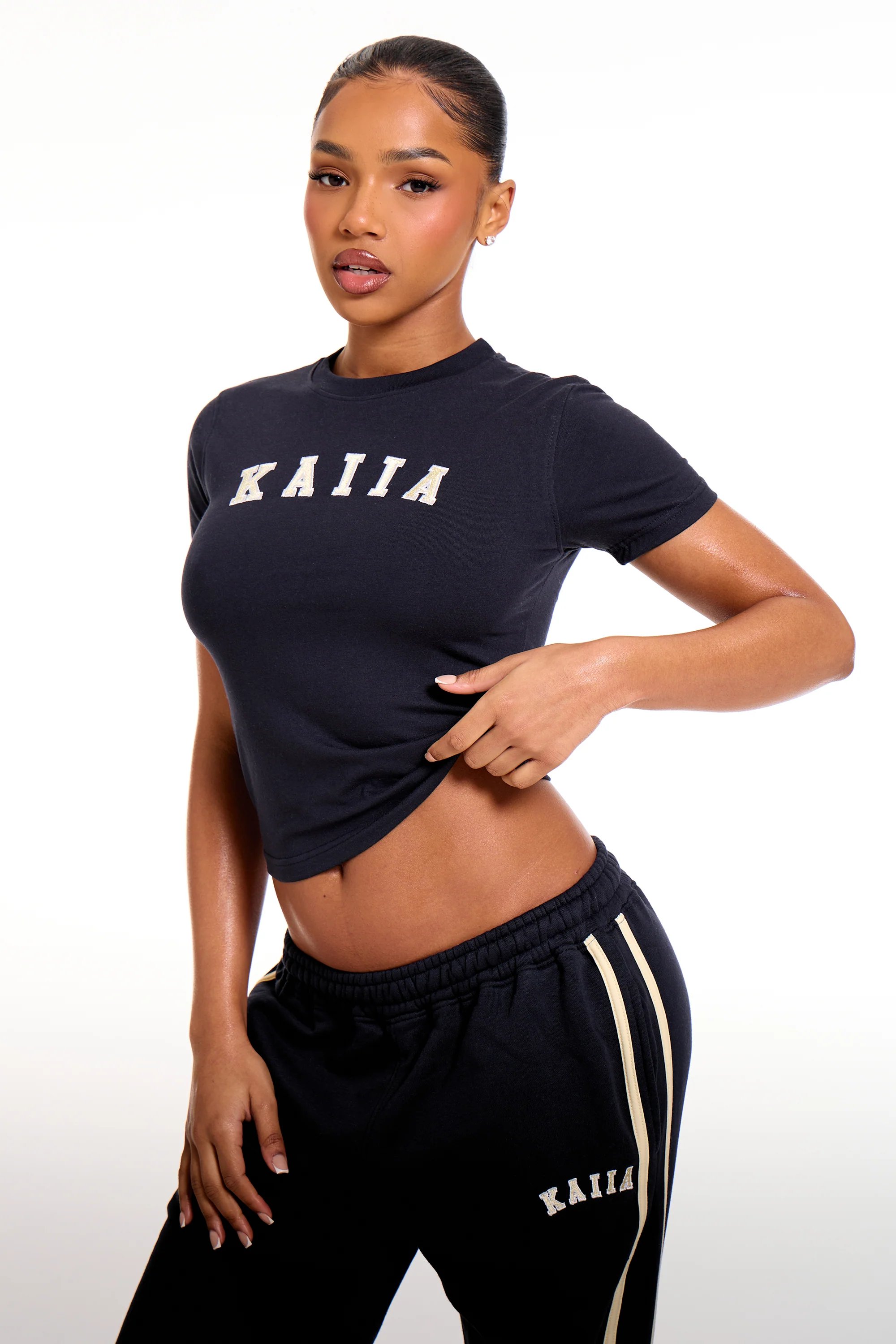 The Kaiia Slogan Baby Tee in Ink Blue is ideal for casual, weekend.