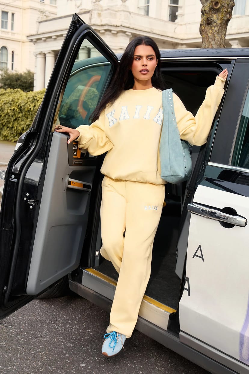 These wide-leg joggers by Kaiia feature a lemon frosting and baby blue colour palette. The bold slogan detail adds a touch of personality, making it a statement piece for everyday wear.