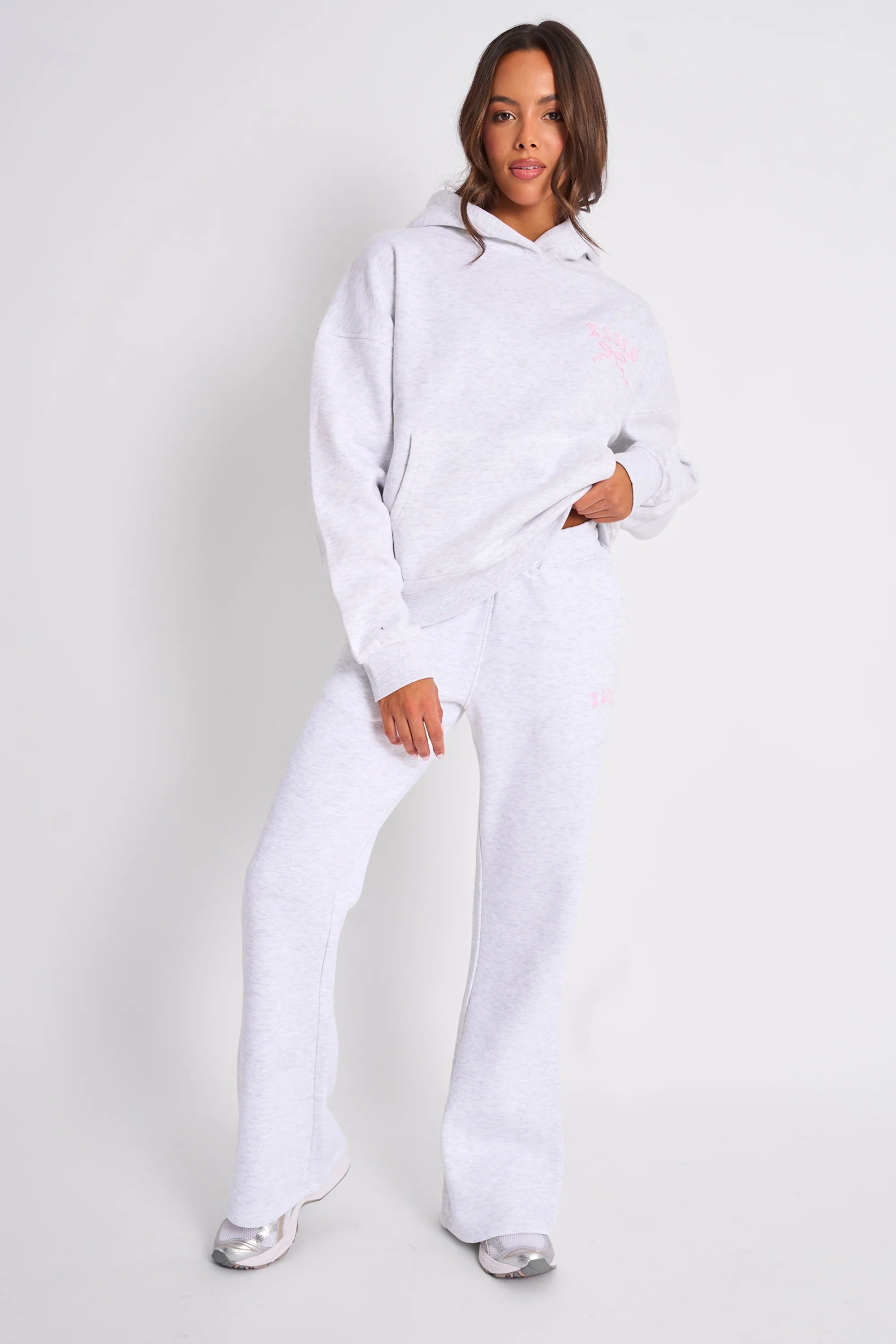 The Kaiia Logo Wide Leg Joggers in Light Grey Marl is available in sizes 12, 14, 16, 18, 20, 22, 24.