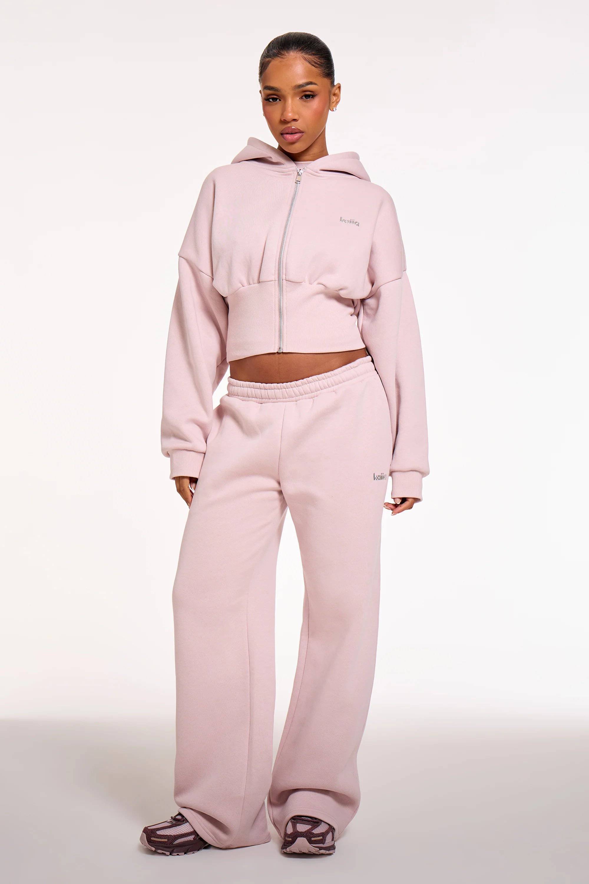 The Kaiia Chrome Logo Wide Leg Joggers in Pale Dusty Lilac is available in sizes 10, 14, 16.