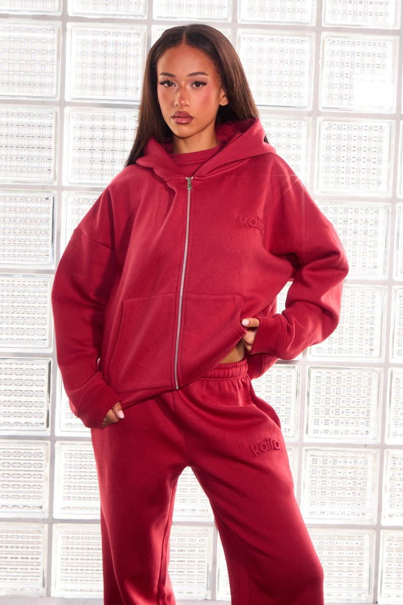 The Kaiia Embossed Logo Oversized Zip Through Hoodie in Deep Red is available in sizes 10, 12, 14, 16, 6, 8.