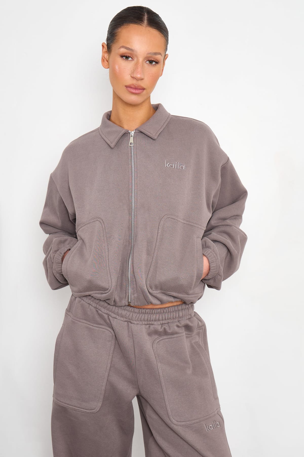 The Kaiia Silver Grey Pocket Detail Zip Through Sweatshirt is made from cotton, polyester.
