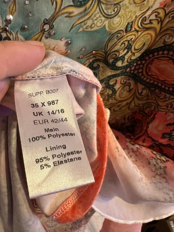 This stunning floaty chiffon blouse with a bold kaleidoscope print in coral, teal, and gold tones is super flattering and eye-catching. The lightweight fabric drapes beautifully, giving that effortless elegant look without trying too hard.