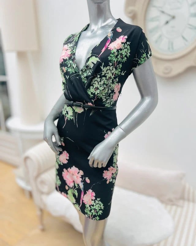 Pretty black dress with green foliage, pink flowers and tropical birds. Wrap style bodice, cap sleeves, and short length. Perfect for casual outings or evening events.
