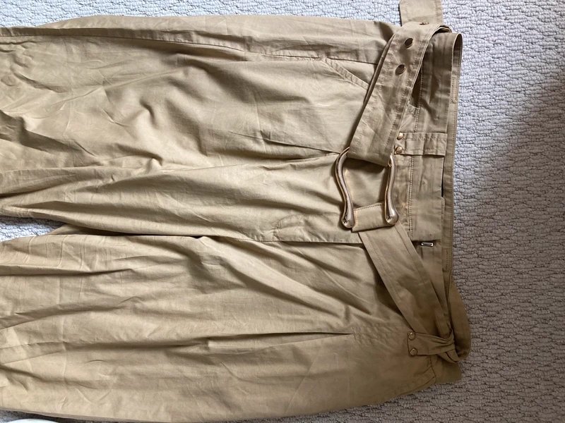 Lightweight khaki coloured 3/4 length trousers ideal for warm weather and easy packing for holidays. Features a loop belt with adjustable studs and side pockets.