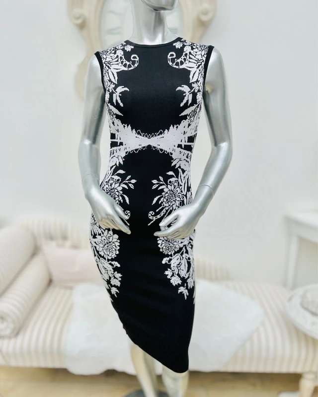 The Karen Millen Signature Art Work Dress is a black and white pencil-fitted, bodycon dress. Designed in vibrant black and white, this knee-length dress features a symmetrical white floral pattern on a black background. Crafted from stretchy knit fabric, it offers a flattering fit and is perfect for special occasions. Includes a full-length jersey slip lining for comfort and coverage.