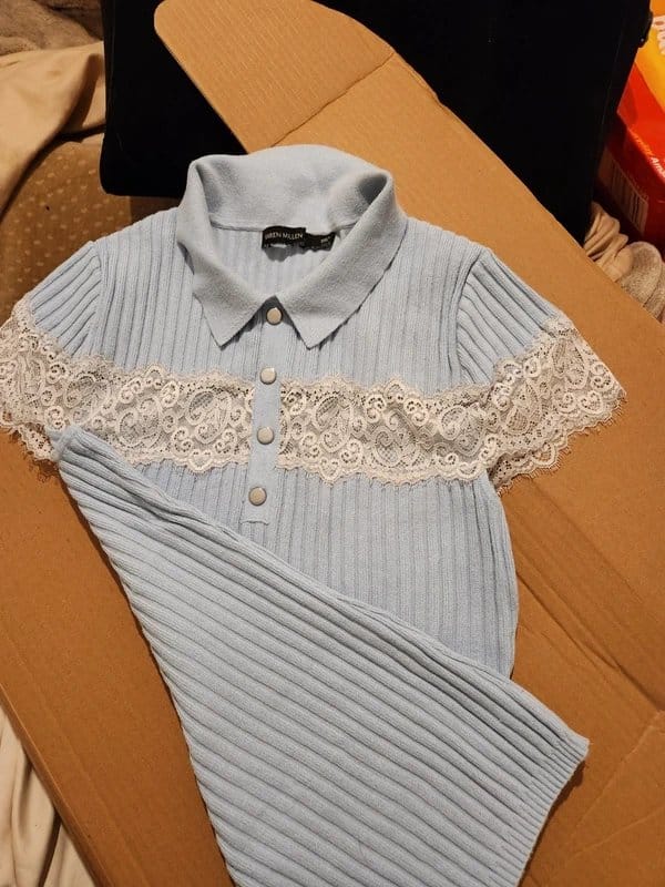 This Karen Millen t-shirt features a light blue ribbed material with lace detailing on the upper chest and sleeves. It's a very feminine and elegant piece, perfect for casual wear.