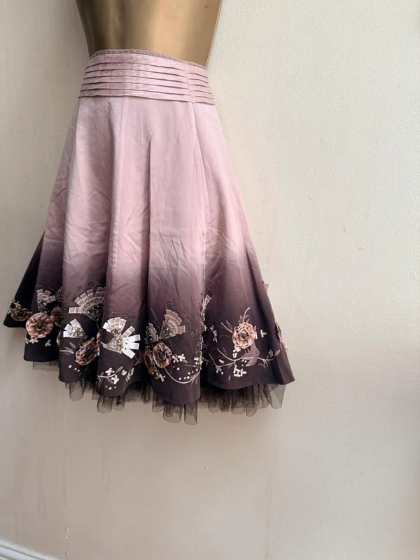 The Karen Millen Blush Pink Brown Silk Knee Length Evening Skirt is ideal for evening, party, formal.