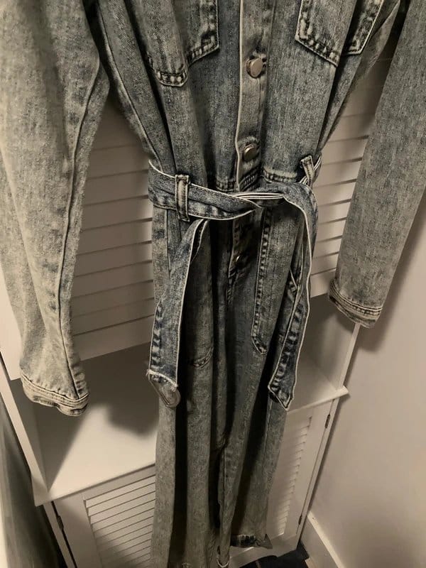This light blue acid wash denim jumpsuit features a belted waist for a flattering fit. Perfect for casual outings or a laid-back day look.