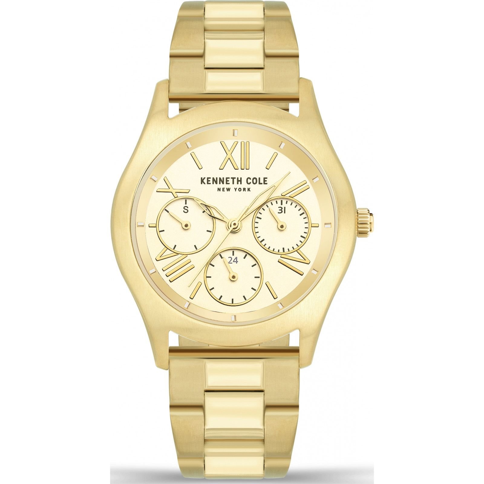 Elegant gold Kenneth Cole Ladies Classic Watch with a 34mm case and quartz movement. Features a cream dial with Roman numerals and date display, encased in a polished gold-tone metal bracelet.