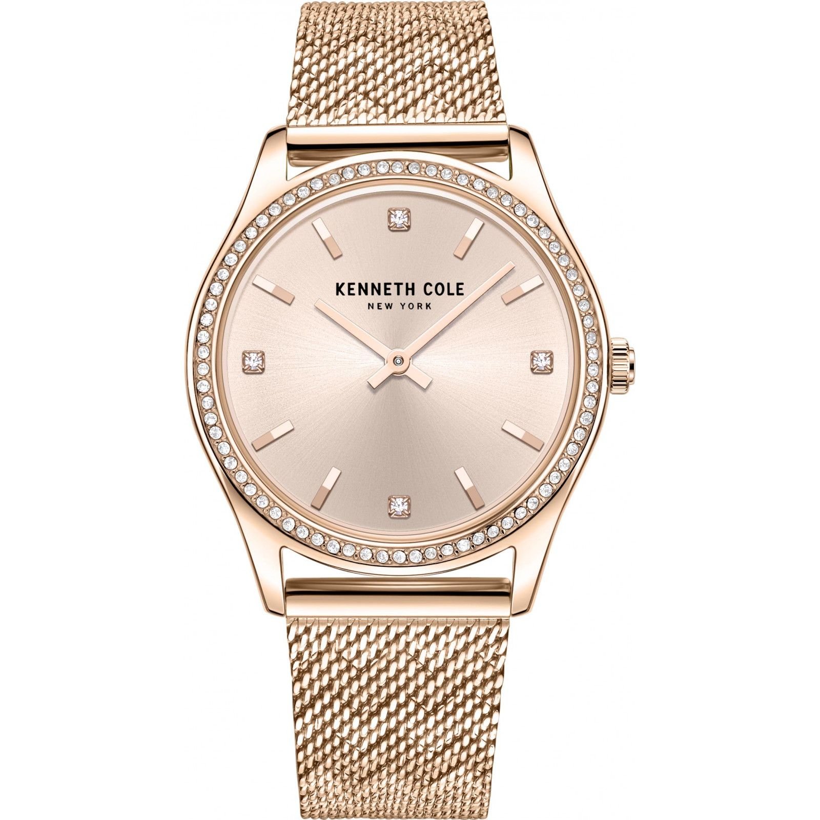 Elegant Kenneth Cole watch with a rose gold mesh band and a champagne dial adorned with crystal accents. A sophisticated accessory for any occasion.