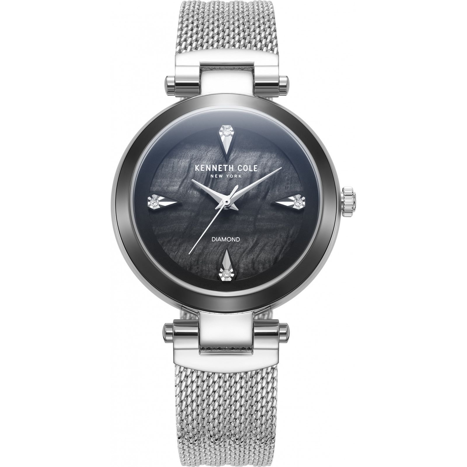 Stylish Kenneth Cole watch with a silver mesh band and black dial adorned with diamond accents. Perfect for adding a touch of elegance to any outfit.