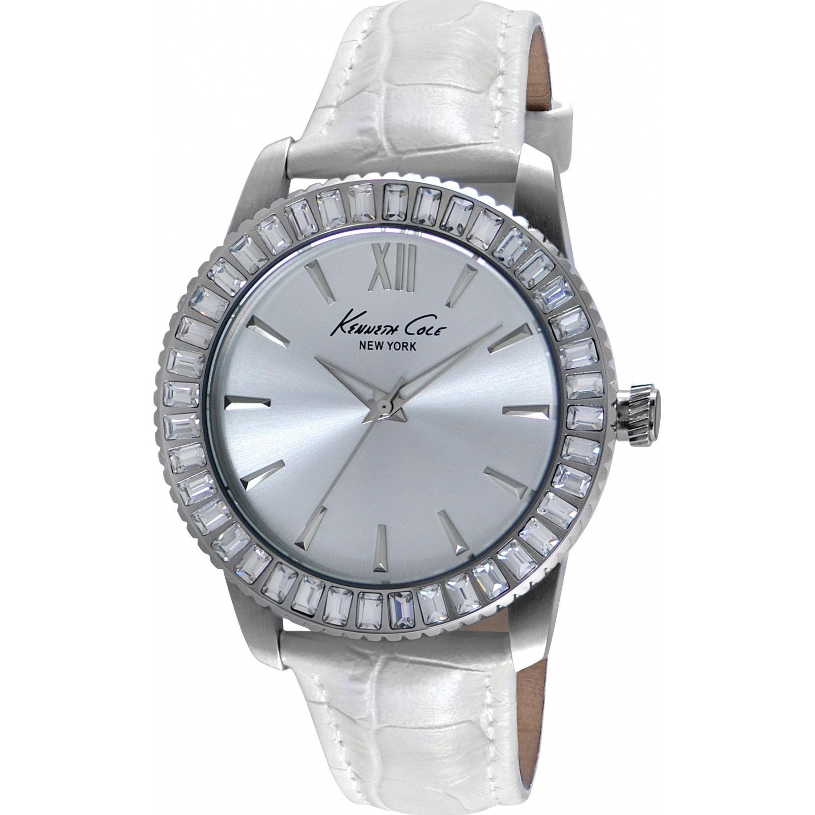 Stylish Kenneth Cole ladies watch with a white dial and crystal-embellished bezel. Features a white leather strap and silver-tone case for a sophisticated look.