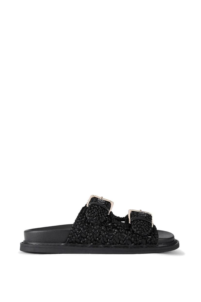 Stylish black rope sandals by KG Kurt Geiger featuring two gold buckles on each foot strap. The moulded footbed ensures comfort, perfect for casual wear.