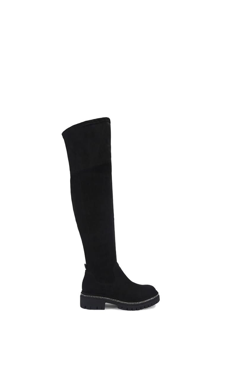 Elegant over-the-knee boots in black suedette with a chunky sole adorned by gunmetal crystals. Perfect for adding a bold touch to any outfit.