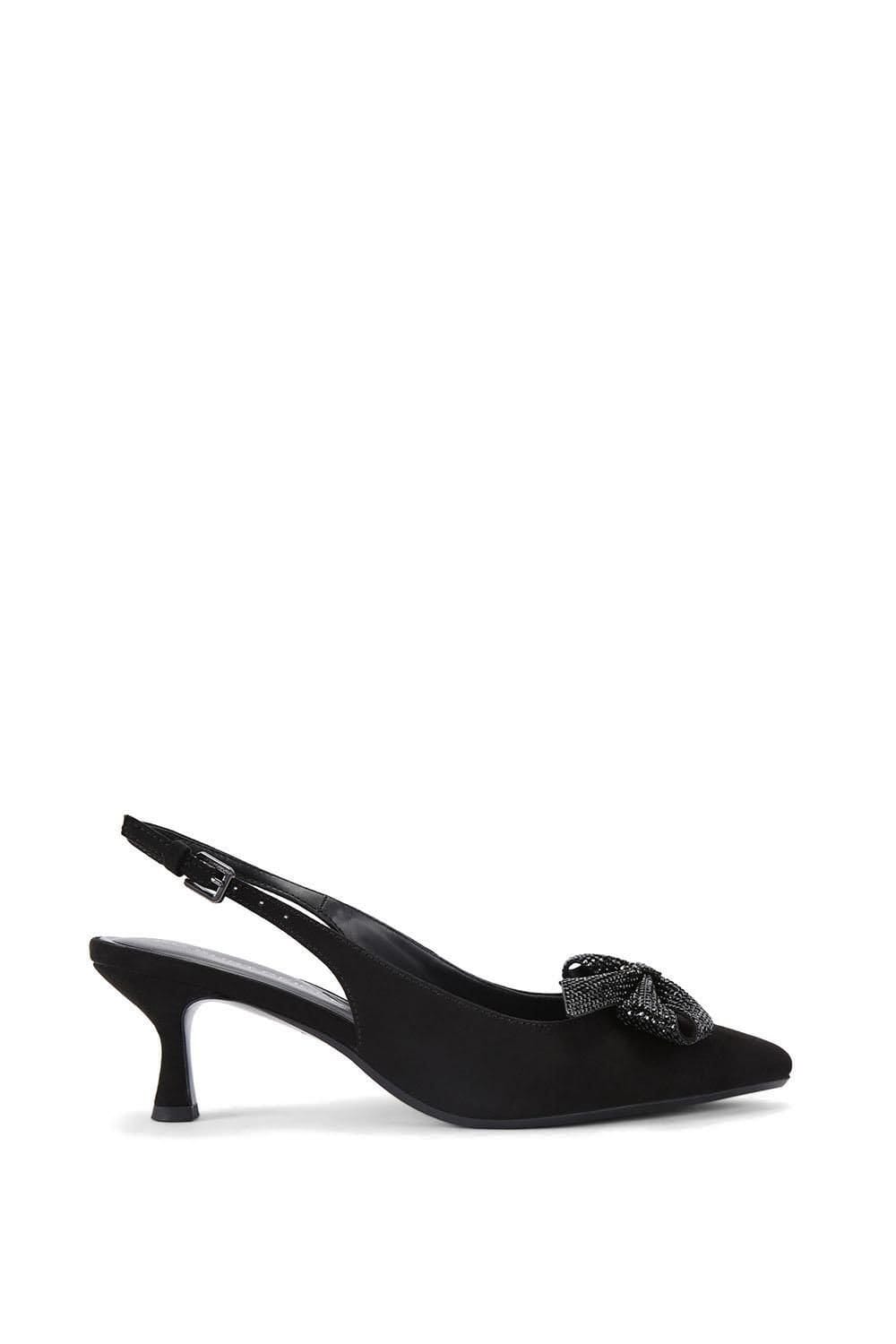 Elegant black suedette heel featuring a pointed toe and a crystal bow on the vamp. The slingback strap adds a touch of sophistication. Perfect for evening events or special occasions.