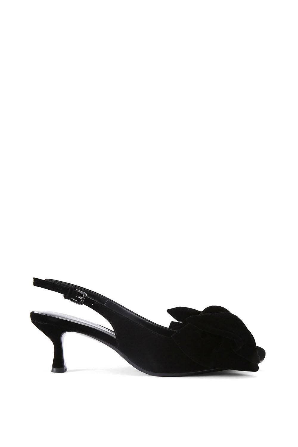 Elegant black velvet slingback heels with a pointed toe and a large fabric bow. The heel height is 5.5cm, offering a subtle lift. Perfect for evening events or special occasions.