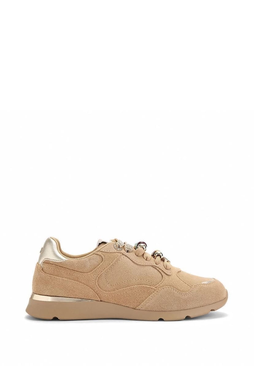 Luxurious camel suede trainers by KG Kurt Geiger featuring a lace-up front with stones and crystal embellishments. Gold metallic patches adorn the tongue and heel, adding a touch of glamour.