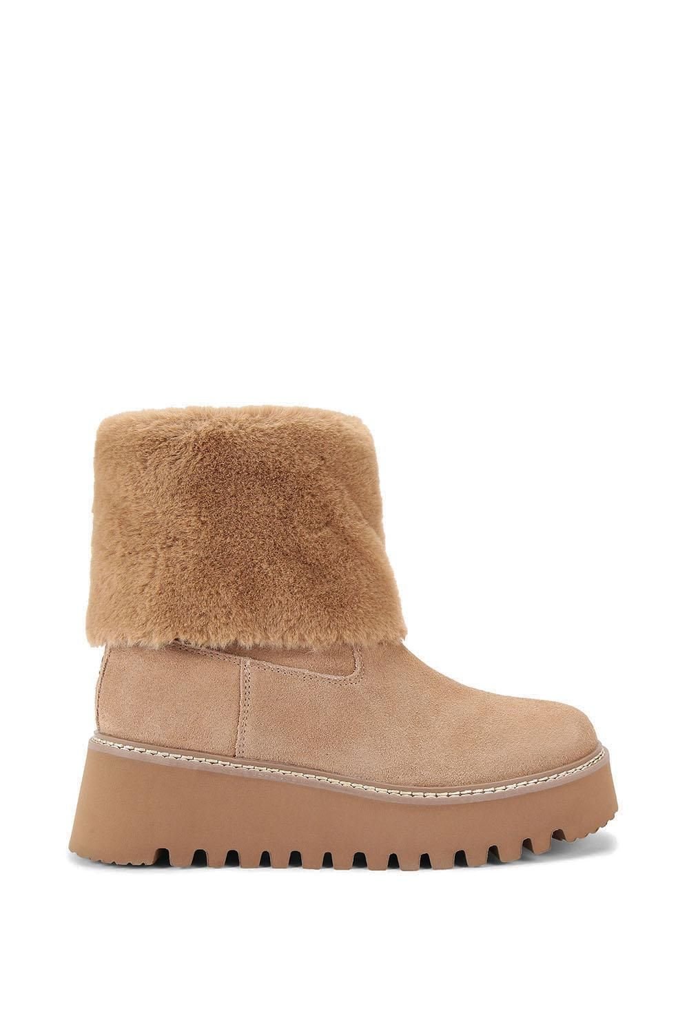 Stylish camel suede ankle boots by KG Kurt Geiger. Featuring a fur-lined cuff and a chunky rubber sole for durability and comfort. Ideal for casual and smart-casual outfits.