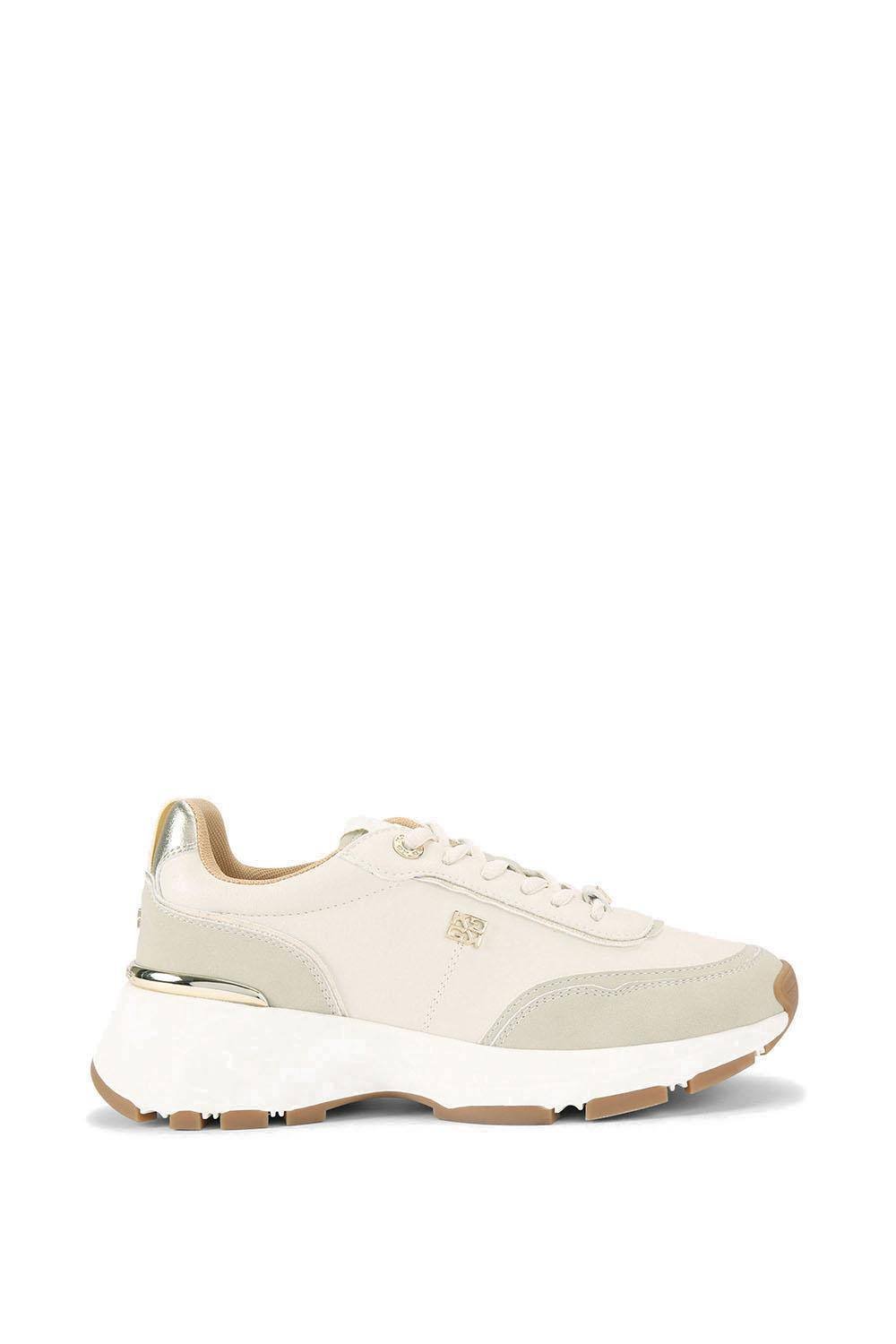 Modern KG Kurt Geiger trainers in cream grained leather alternative. Features gold-tone branding and a chunky white platform sole with a brown rubber outsole. Perfect for casual wear.
