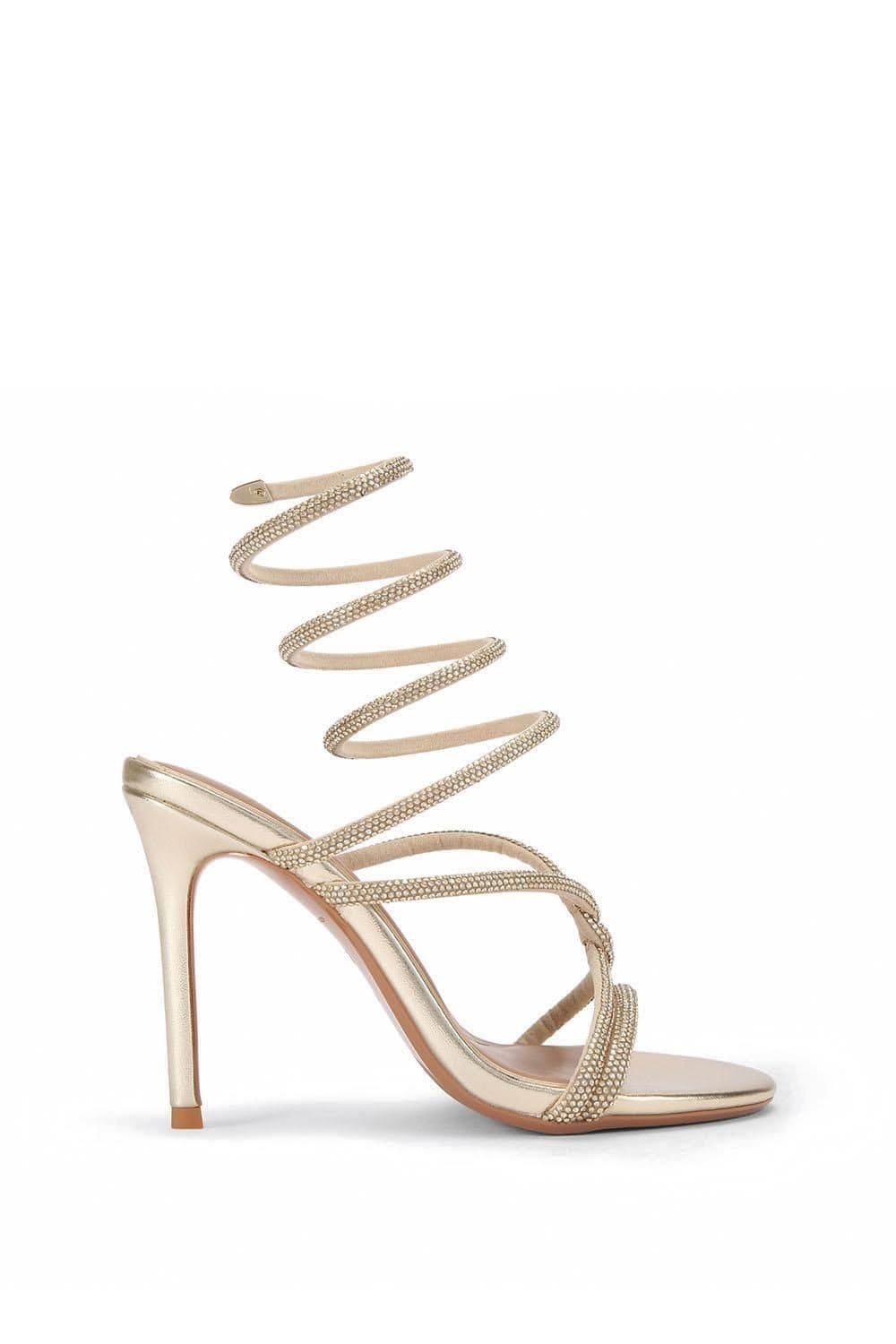 Luxurious gold high heels with a spiral strap design and crystal embellishments. The 11cm stiletto heel adds height and elegance, perfect for evening events.