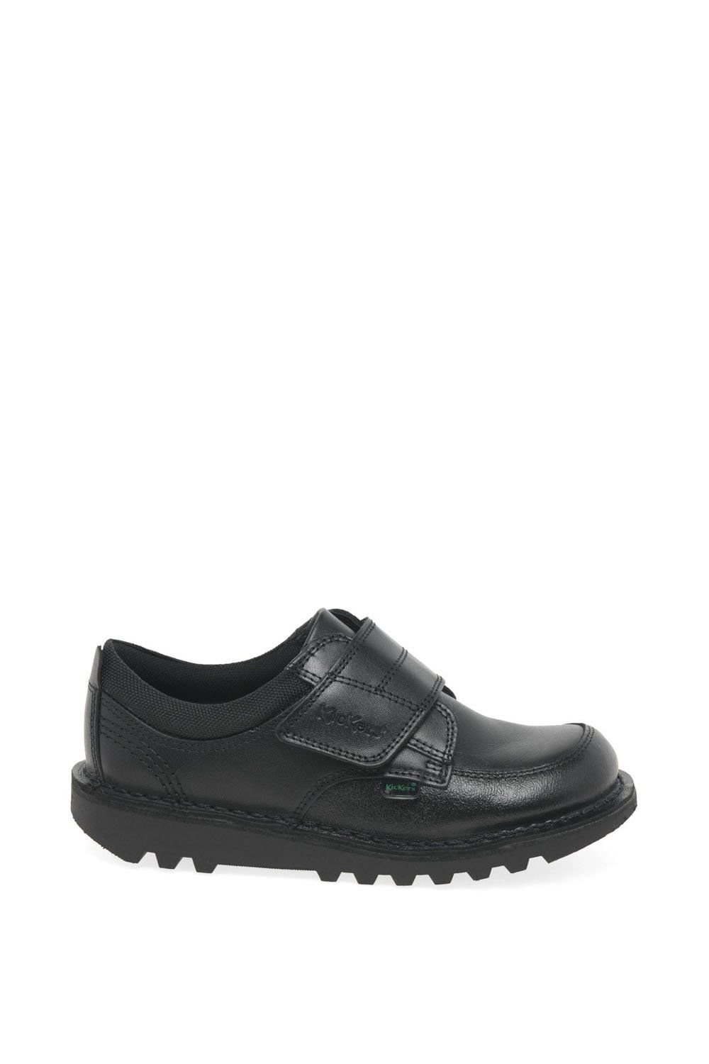 Stylish and durable black leather school shoes for boys by Kickers. Featuring a soft leather upper, textile lining, and padded collar for comfort. The chunky rubber sole provides excellent grip, making them ideal for school and play.