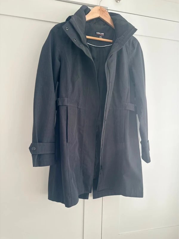 This charcoal grey, waterproof jacket features a detachable hood with a slightly peaked design to prevent drips on your face. Perfect for dashing from the car during Spring showers, it offers a slimming shape and looks smart when worn.