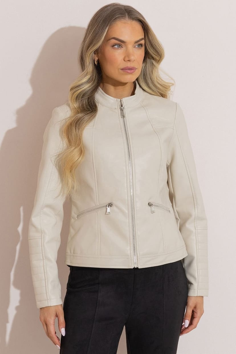 Make a bold statement with this ivory faux leather racer jacket. Cut in a flattering, structured shape, it features a round neckline, zip cuffs, front zip fastening, and two zip pockets. A timeless staple, perfect for versatile, season-to-season dressing.