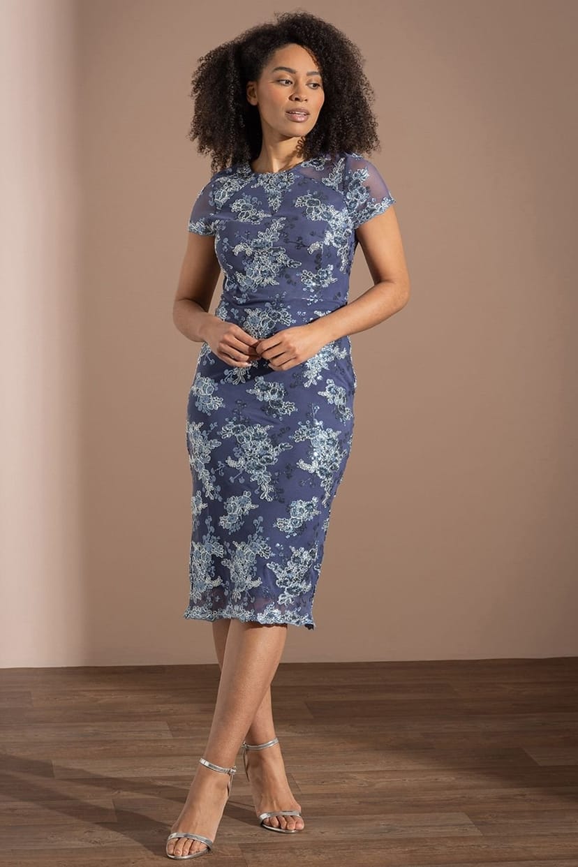 View Debenhams's returns policyElegant mesh dress in midnight blue adorned with a floral and sequin embroidery design. Features a round neckline, short sleeves, and a back zip fastening. Lined for coverage, it falls just below the knee, perfect for any occasion.
