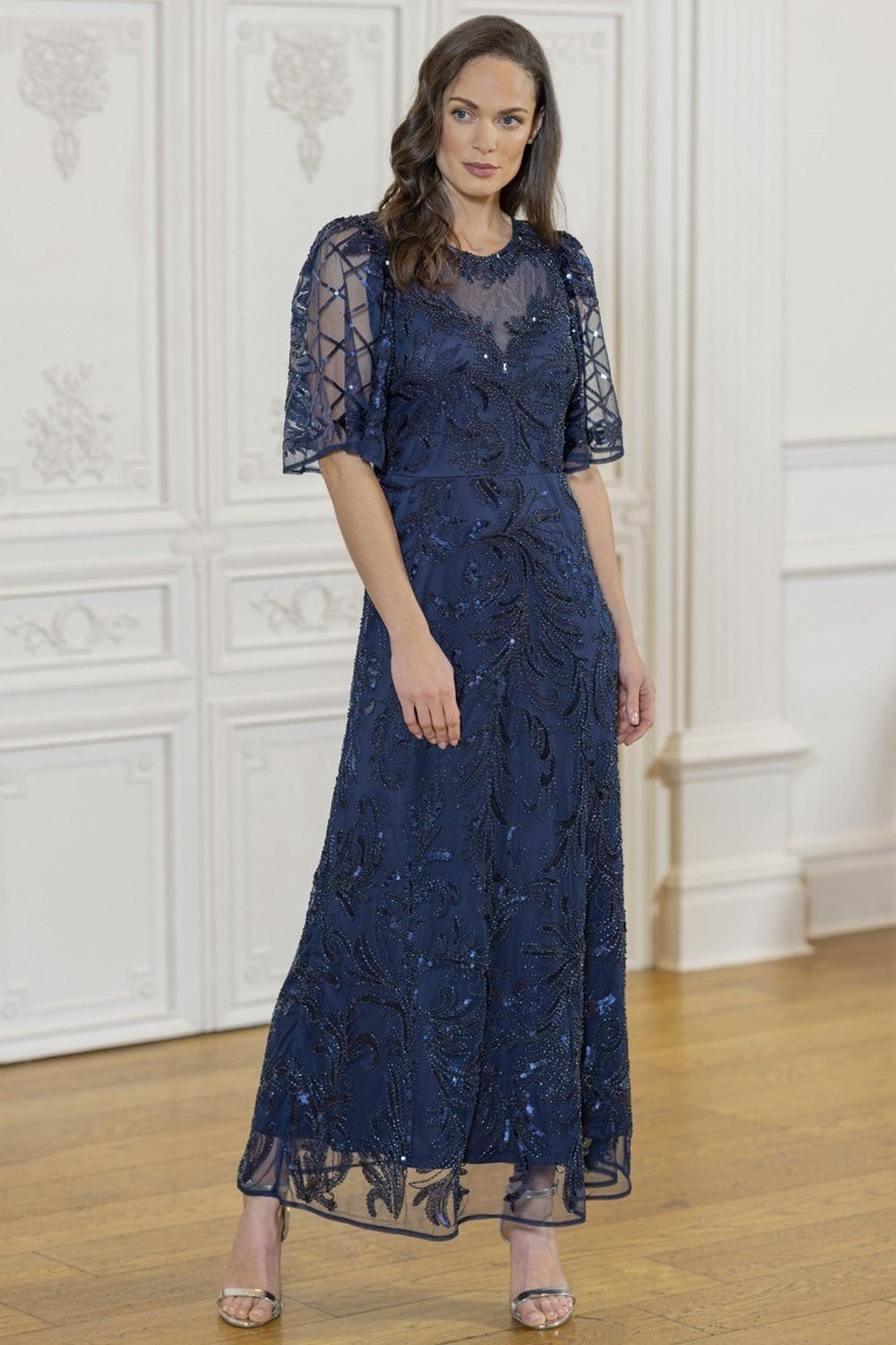 Elegant maxi dress in midnight blue featuring embellished mesh fabric with beads, embroidery, and sequins. The dress has wide elbow-length sleeves and a polished bust structure. Ideal for any special event.