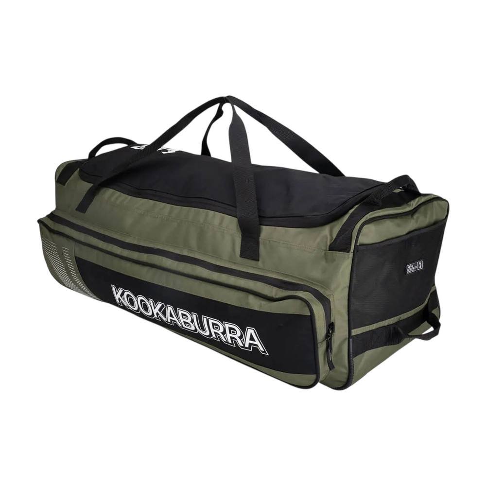 Stylish wheeled cricket bag by Kookaburra in dark green. Made from durable 600D ripstop polyester, it features a spacious 91L capacity, two wheels, and braided nylon straps. Ideal for carrying cricket gear with ease.