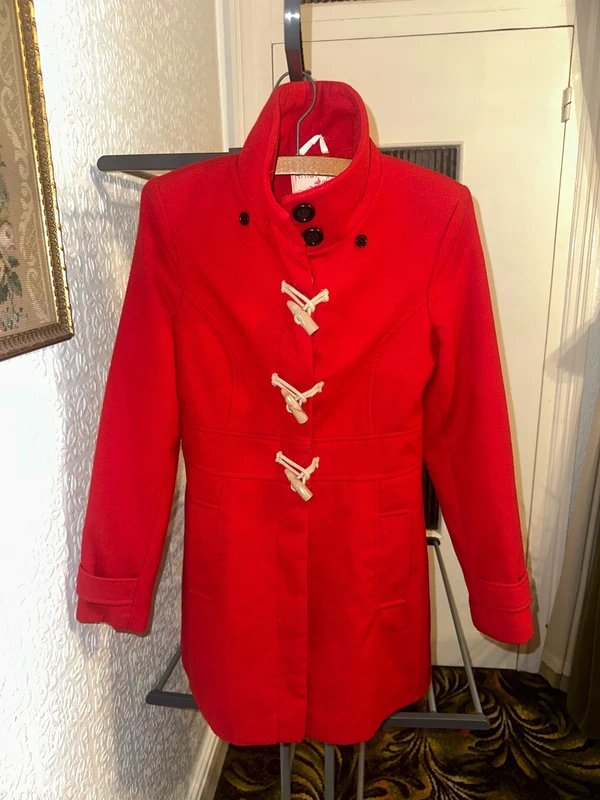 The Krisp Bright Red Toggle Coat is available in sizes S.