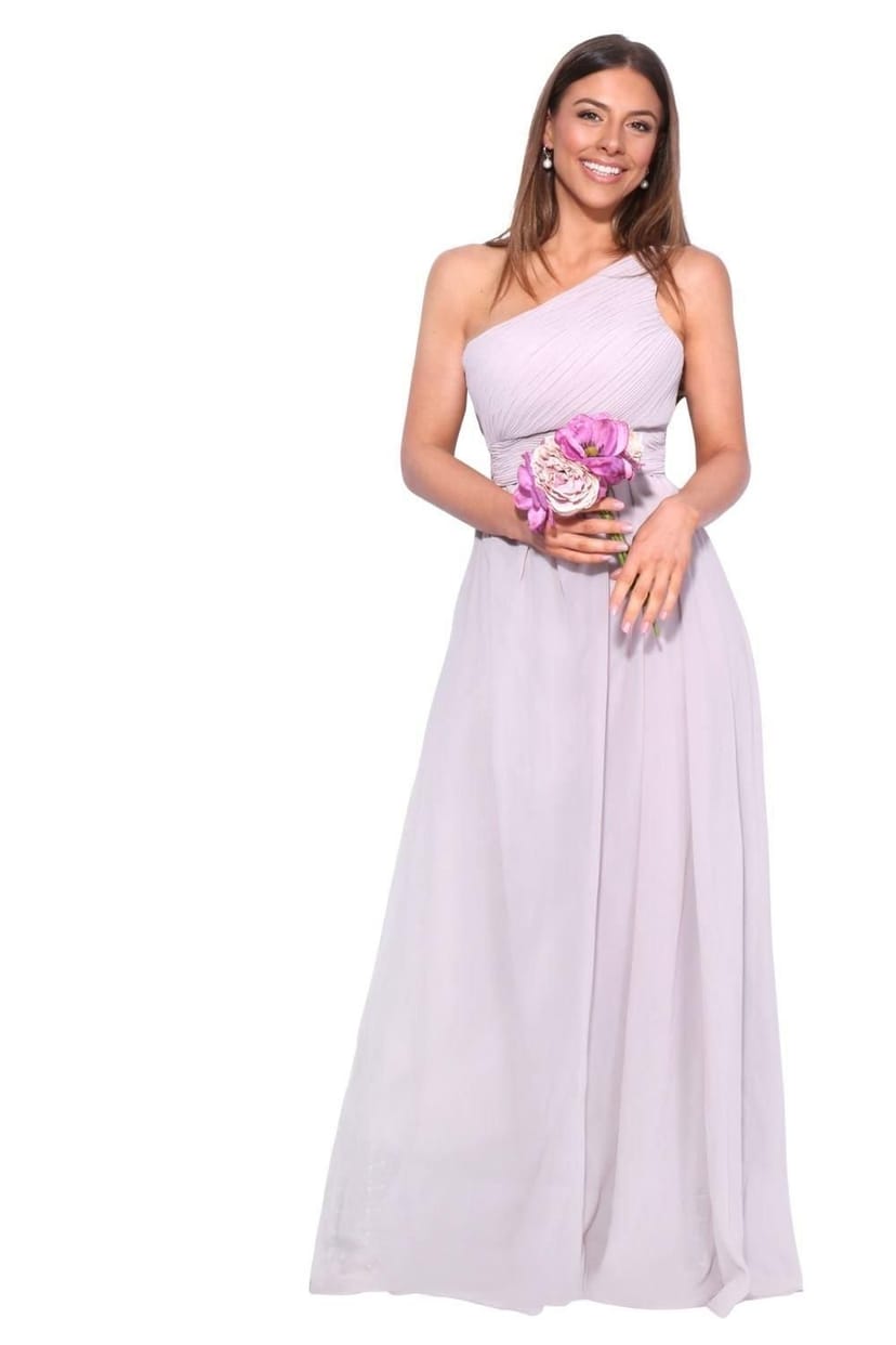 Elegant one shoulder evening maxi dress in nude. Features a pleated and padded bust for a bra-free fit and an elasticated back for a flattering silhouette. Perfect for evening events or special occasions.