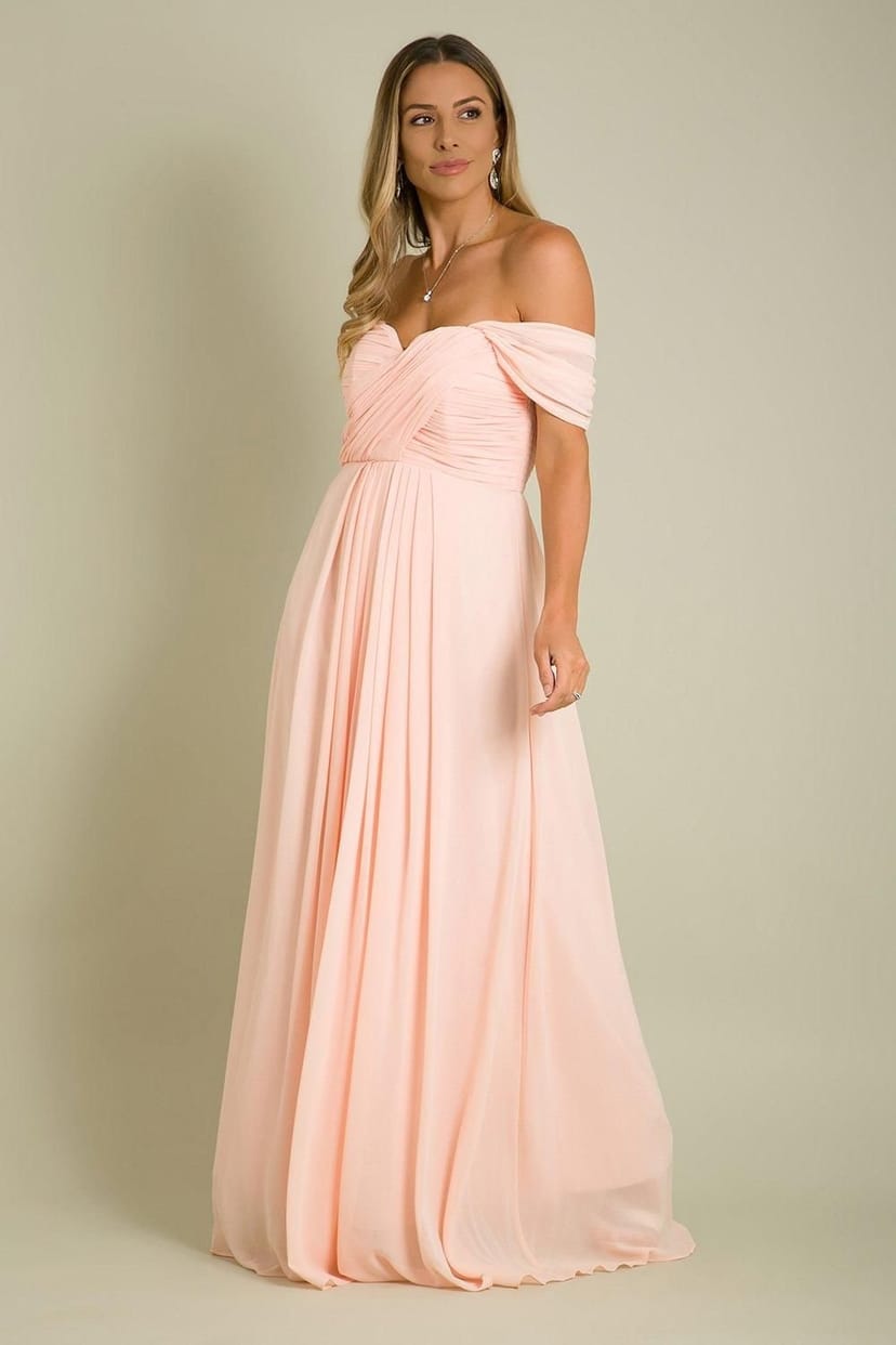 Sophisticated pink chiffon gown with an off-shoulder neckline and adjustable sleeves. The maxi length and pleated bodice create a graceful silhouette. Ideal for formal events and evening wear.
