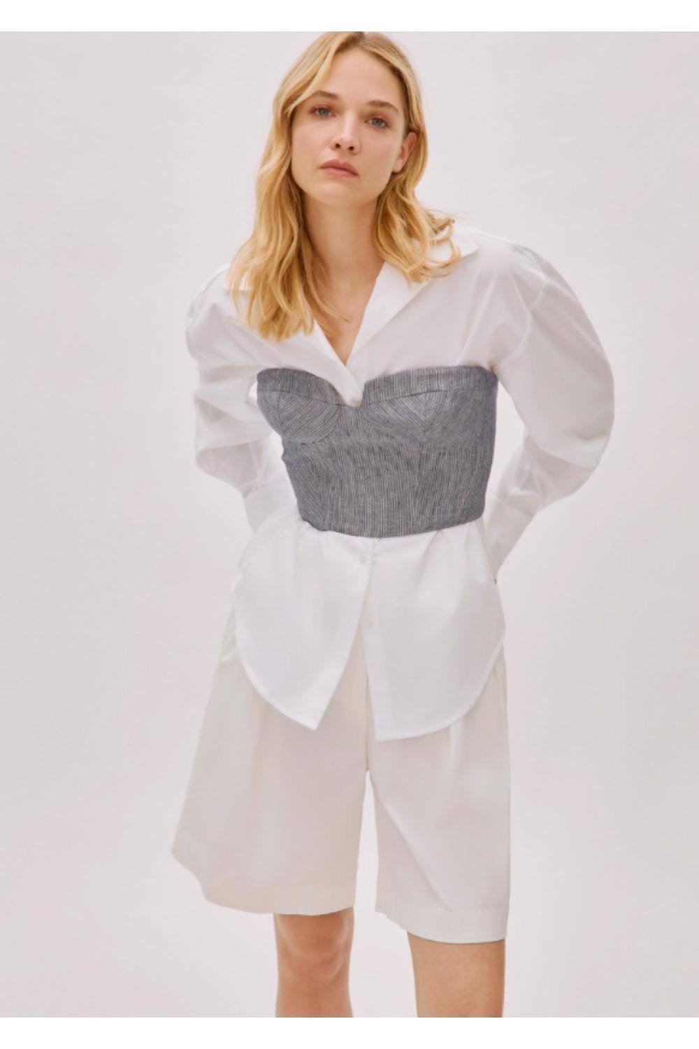 This blue striped bustier top by Labeca is a versatile piece crafted from a blend of linen, silk, and wool. It features a distinctive bustier design with a striped pattern and puff sleeves for a chic look. Ideal for layering or wearing solo, it adds a touch of elegance to any outfit.