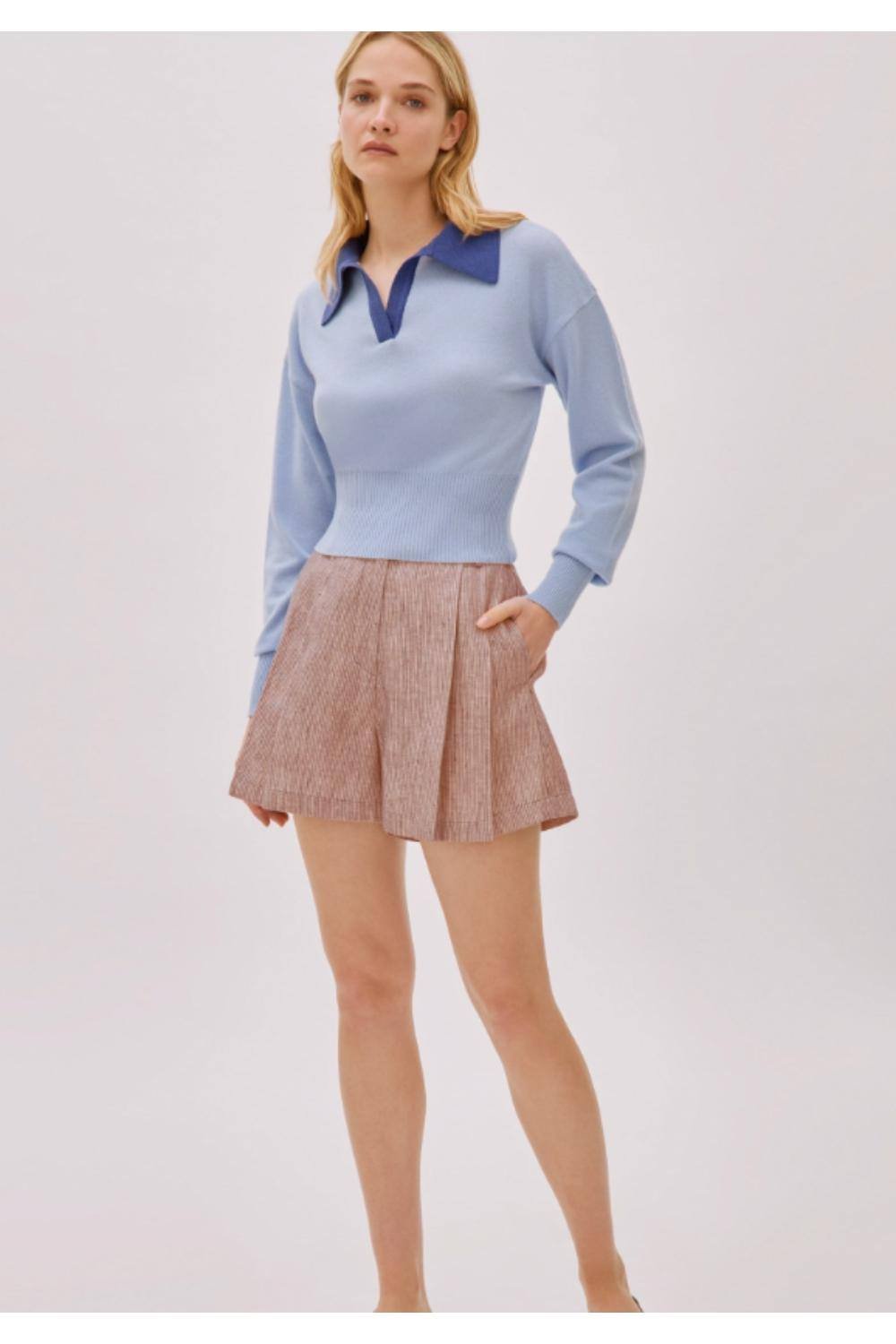 Stylish rose linen-blend striped shorts with a versatile design. Perfect for pairing with crisp shirts, relaxed tees, or structured blazers. Made from a premium fabric blend with a subtle striped pattern.