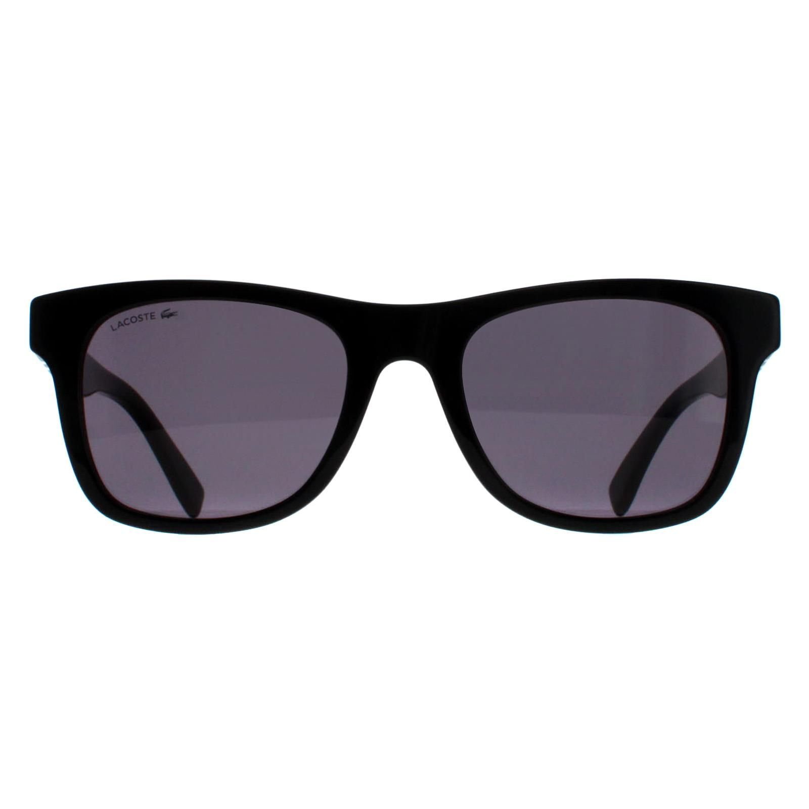 Classic wayfarer-style Lacoste sunglasses in black and grey. Featuring the iconic Lacoste crocodile logo and a white and green stripe design on the temples. Perfect for a casual yet stylish look.