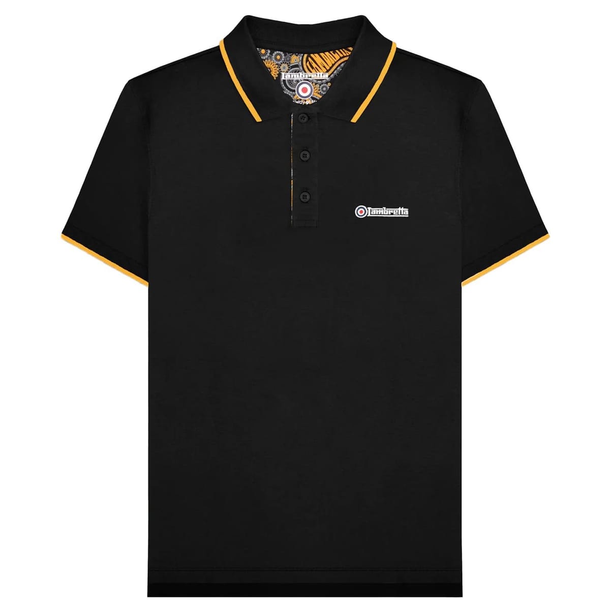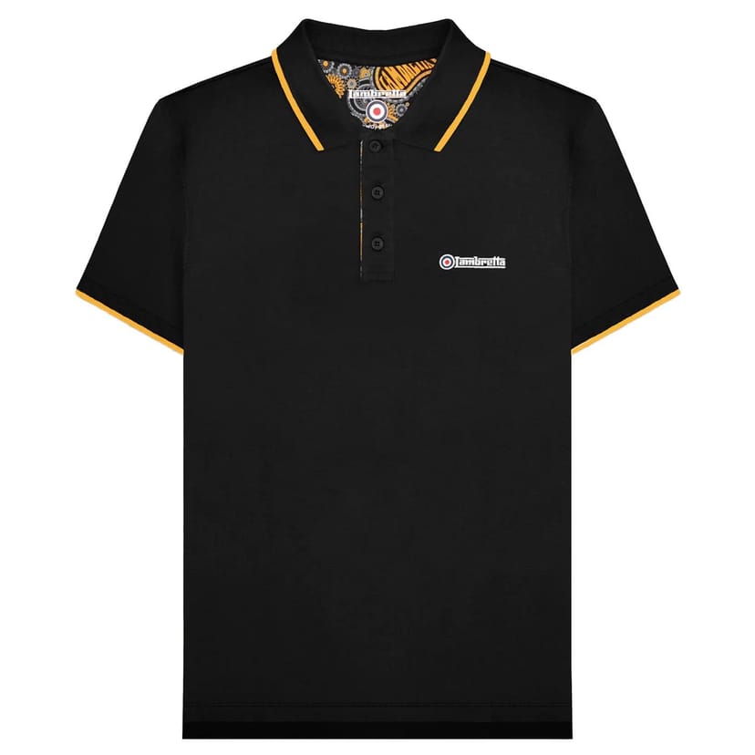 Stylish black polo shirt by Lambretta made from 100% cotton jersey. Features a paisley printed lining, embroidered logo, and a tipped collar with a button placket. Ideal for a casual yet chic look.