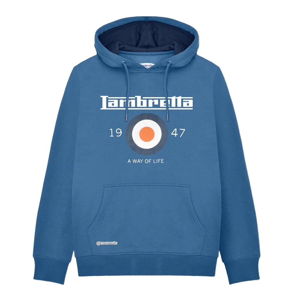 This dark blue hoodie is made from a blend of 70% cotton and 30% polyester. It features a printed design with the iconic Lambretta logo and text. The hood has a contrast lining, and the neckline is hooded. The sleeves are long with ribbed cuffs, and it has a kangaroo pocket. The hem is also ribbed for a snug fit.