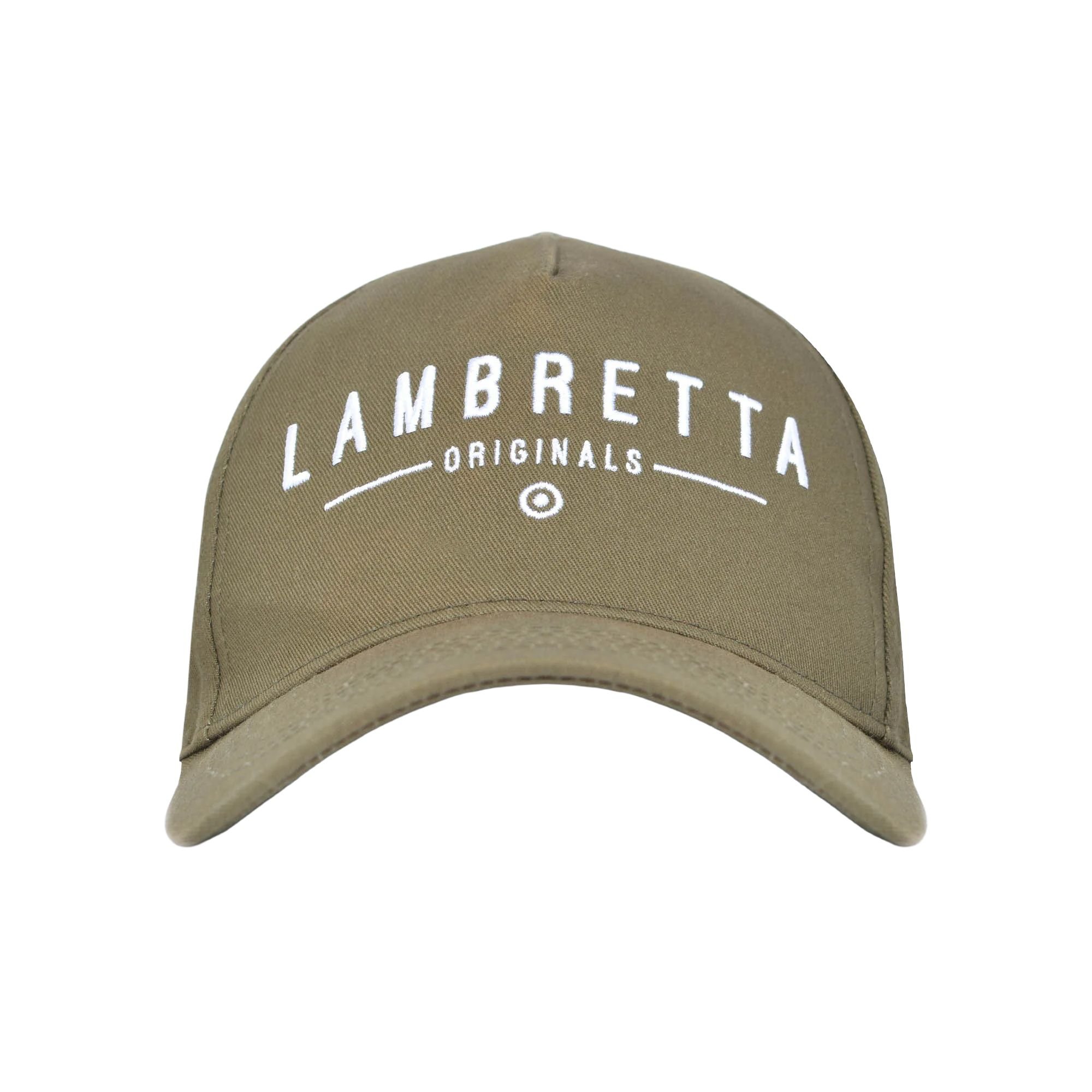 Stylish Lambretta cap in olive green with a 5-panel design and embroidered branding. Made from 100% cotton for a comfortable fit. Features a curved peak and adjustable snap closure.
