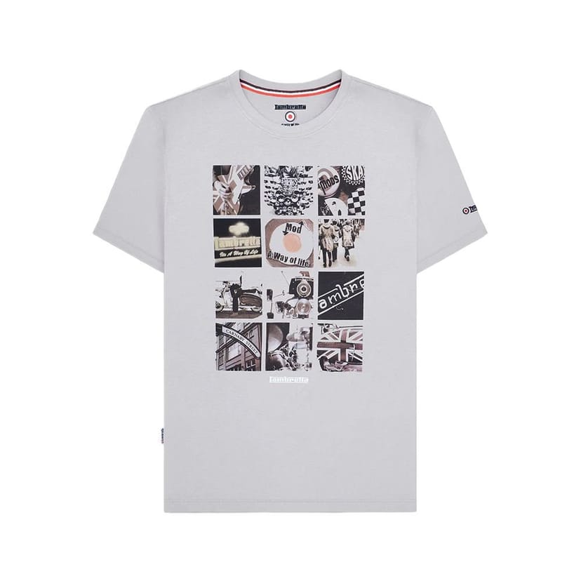 The Lambretta Men's SS24 Photo Print T-Shirt in Grey is available in sizes 2xl, 3xl, 4xl, l, m, xl.