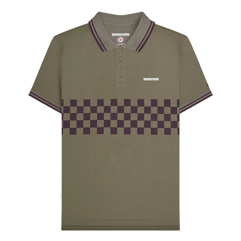 Stylish khaki polo shirt by Lambretta made from 100% cotton. Features a checkered design with a double tipped collar and a 3-button placket. Ideal for a casual yet smart look.