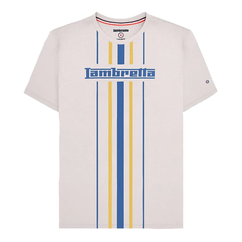 Stylish mid grey t-shirt by Lambretta featuring a vertical stripe design with blue, yellow, and red accents. Made from 100% cotton for a comfortable fit. Ideal for casual outings or layering.
