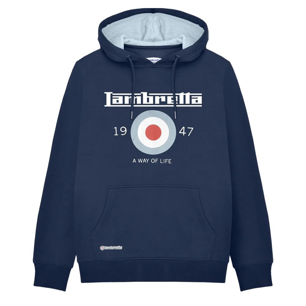 The Lambretta Navy Cotton/Polyester Hoodie is available in sizes 2XL, 3XL, 4XL, L, M, S, XL.