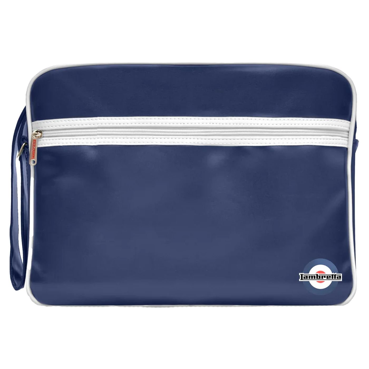 Stylish Navy Lambretta Retro Bag crafted from PU material. Features a full zip fastening, adjustable shoulder strap, and contrast piping. Ideal for everyday use with its spacious zipped compartment.