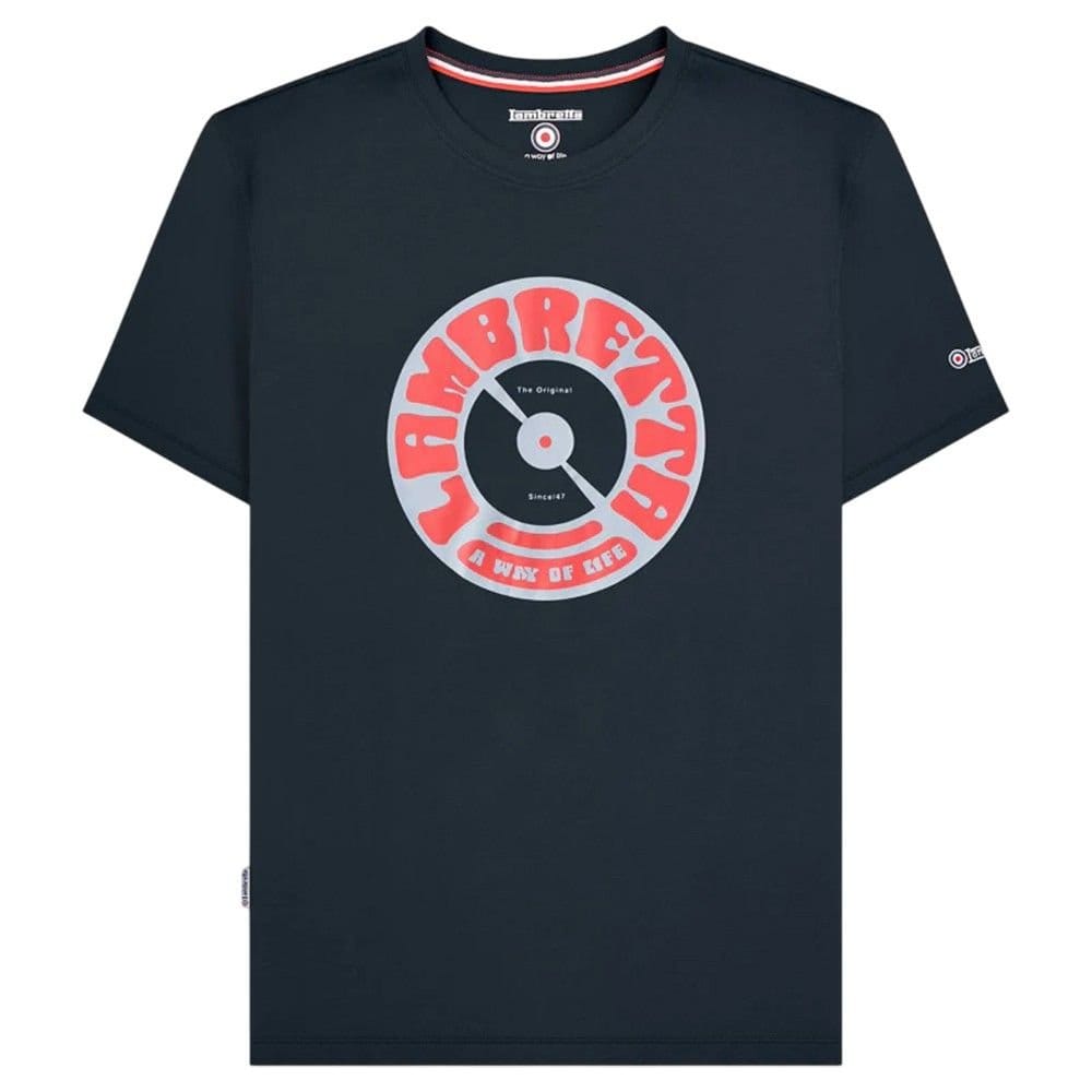 Stylish Navy cotton crew neck t-shirt from Lambretta. Features an embroidered logo, printed design, and a branded tab. Ideal for casual wear.