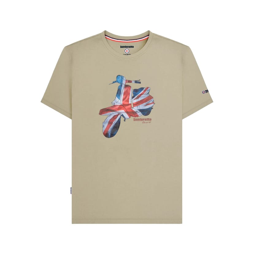 Casual men's t-shirt in stone featuring an embroidered scooter design and Union Jack print. Made from 100% cotton for comfort and breathability. Ideal for a relaxed, everyday look.