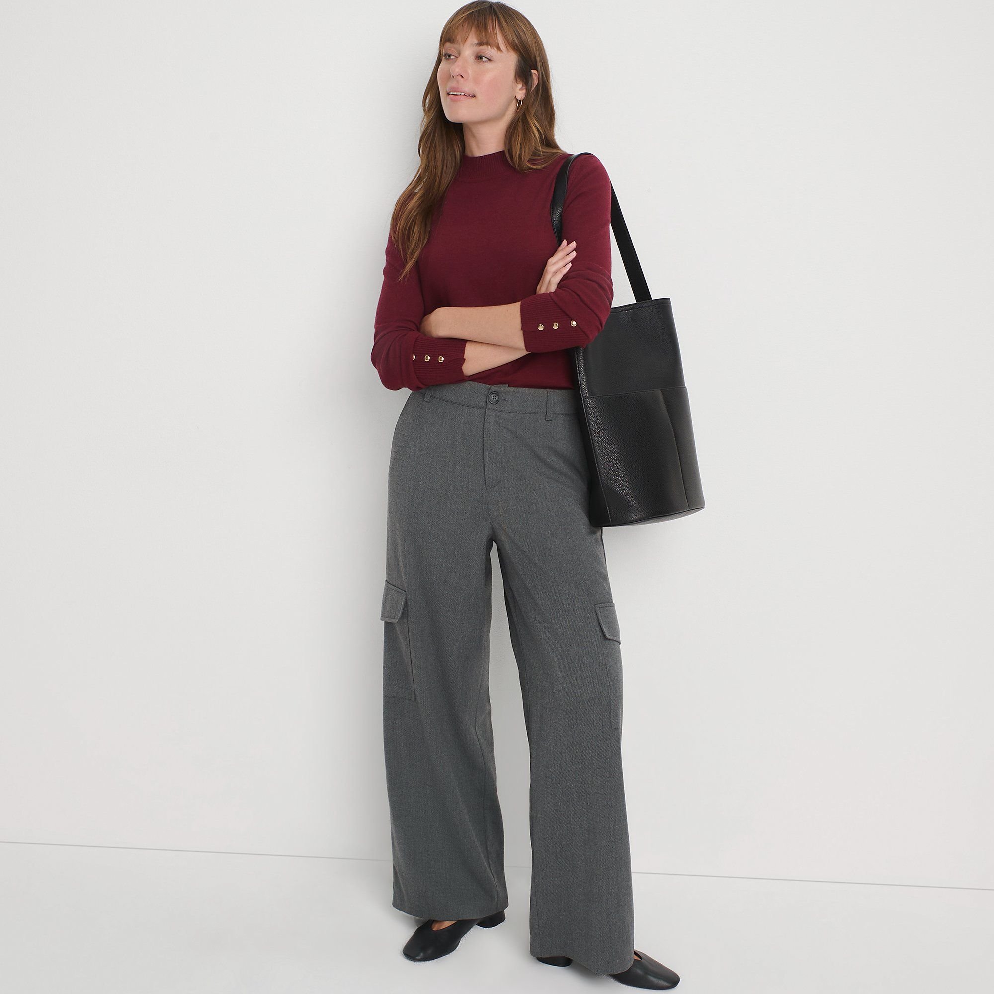 Stylish wide-leg trousers in charcoal brushed twill fabric. Features a comfortable stretch waistband, ample thigh pockets, and a soft yet substantial texture. Ideal for a petite fit.