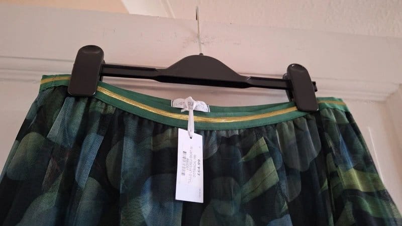 A stunning tulle skirt with a beautiful leaf and flower print in shades of green. Features two layers of tulle and a linen lining. The elasticated waist ensures a comfortable fit. Perfect for casual and evening wear.